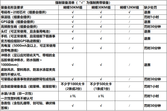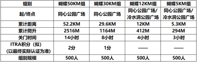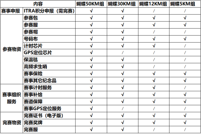 3.蝴蝶50KM组:提供2年以内,30公里或以上里程距离越野赛或全程马拉松线下完赛证书,不接受线上赛证书及跑步轨迹证明。