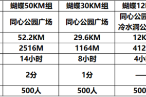 (一)蝴蝶50KM组、30KM组和12KM组男、女前3名按枪声计时成绩录取。详见下表: