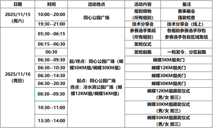 1.蝴蝶50KM组、30KM组和12KM组均采用感应计时,感应计时芯片将在选手通过起点线开始计时,选手须佩戴组委会提供的一次性计时芯片方为有效,计时芯片将在物品领取现场与号码布同时发放,不收取芯片押金;