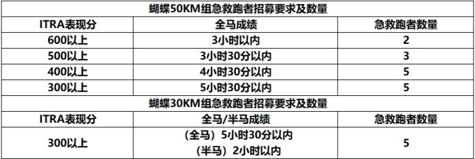 1.本次赛事招募20名(蝴蝶径50KM组(15名)、蝴蝶径30KM组(5名))持有相关急救技能证件的急救跑者;急救跑者报名需收取押金费用300元/人;